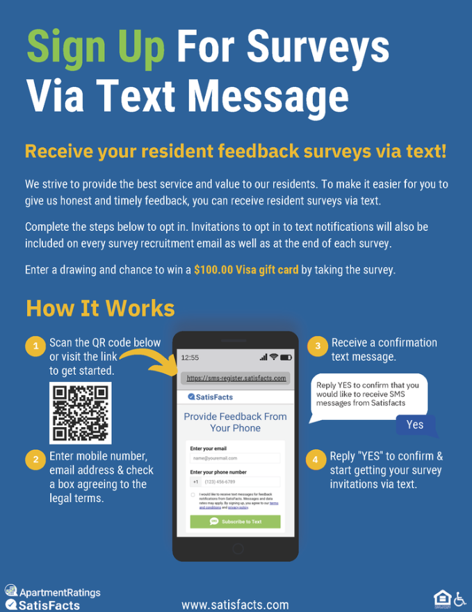 Stay connected and help us improve! Residents can now receive quick surveys by text message — making it easier than ever to share your feedback. Plus, by participating, you’ll be entered for a chance to win a $100 Visa gift card!